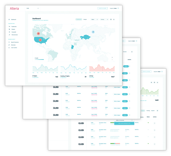 Alteria bietet Ihnen maßgeschneiderte Berichte über Ihr Marken- und Geschmacksmusterportfolio, Online-Verletzungen und Takedowns.